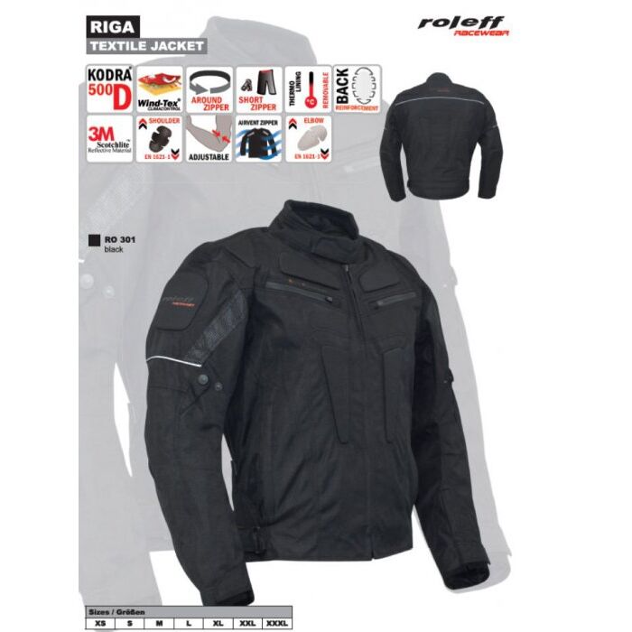 Materiał zewnętrzny: Kodra 500, membrana Wind-Tex termiczna, ściągacze na rękawach, krótki i długi zamek wszyty w kurtkę, ochraniacz pleców wyciągany, odblaski 3M, AIRvent wentylacja na zamkach, ochraniacze CE na łokciach, ochraniacze CE na barkach, zewnętrzne suwaki. Roleff GMBH istnieje od 1988 roku. Od samego początku firma skupiła się na produkcji odzieży motocyklowej. Wszystkie produkty Roleff zyskują wysokie noty w prasie motocyklowej niemieckiej. Aktualnie Roleff sprzedawany jest w 21 krajach, a samych Niemczech w ponad 2500 sklepach motocyklowych.
